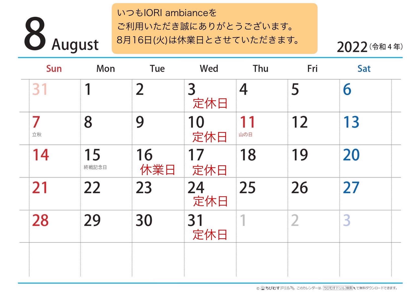 【休業日】8月16(火)