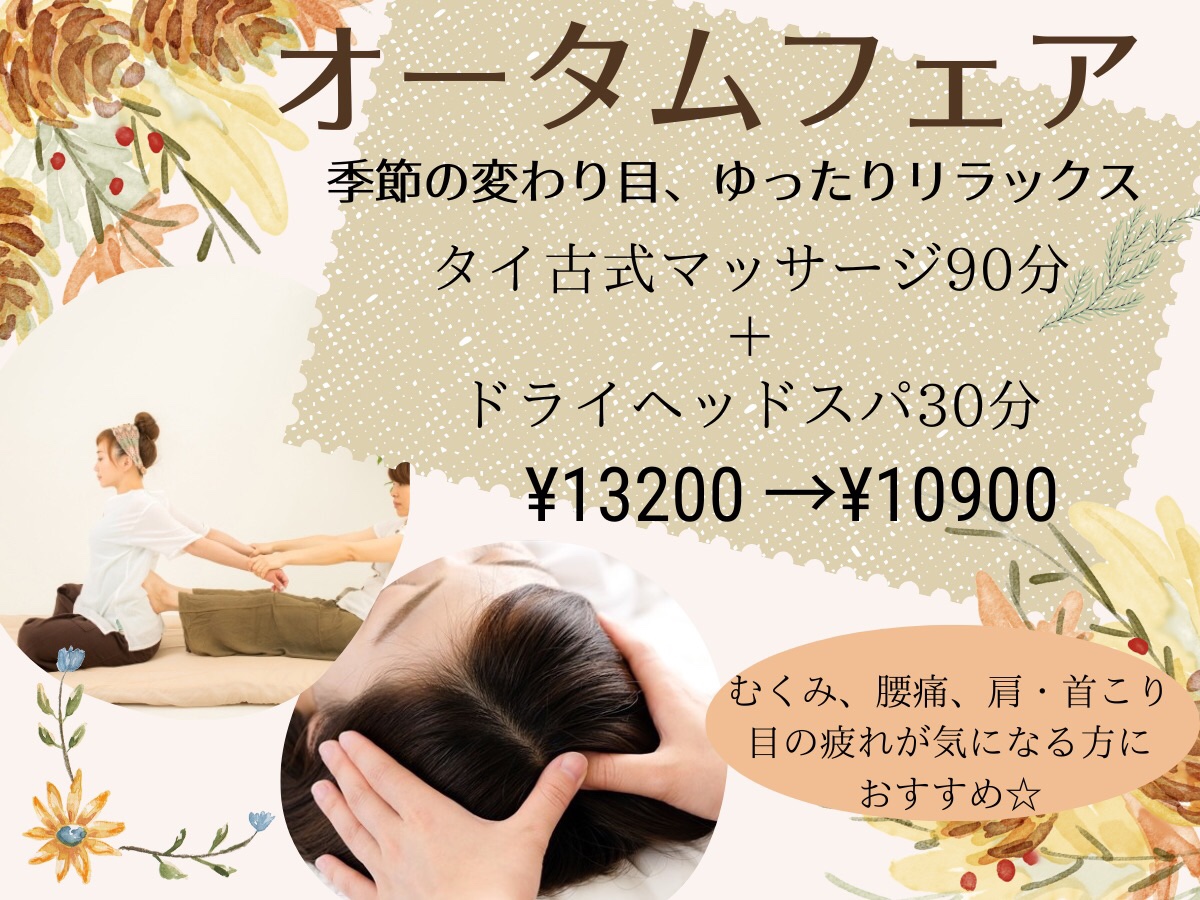 ★オータムフェア★タイ古式マッサージ90分+ドライヘッドスパ30分