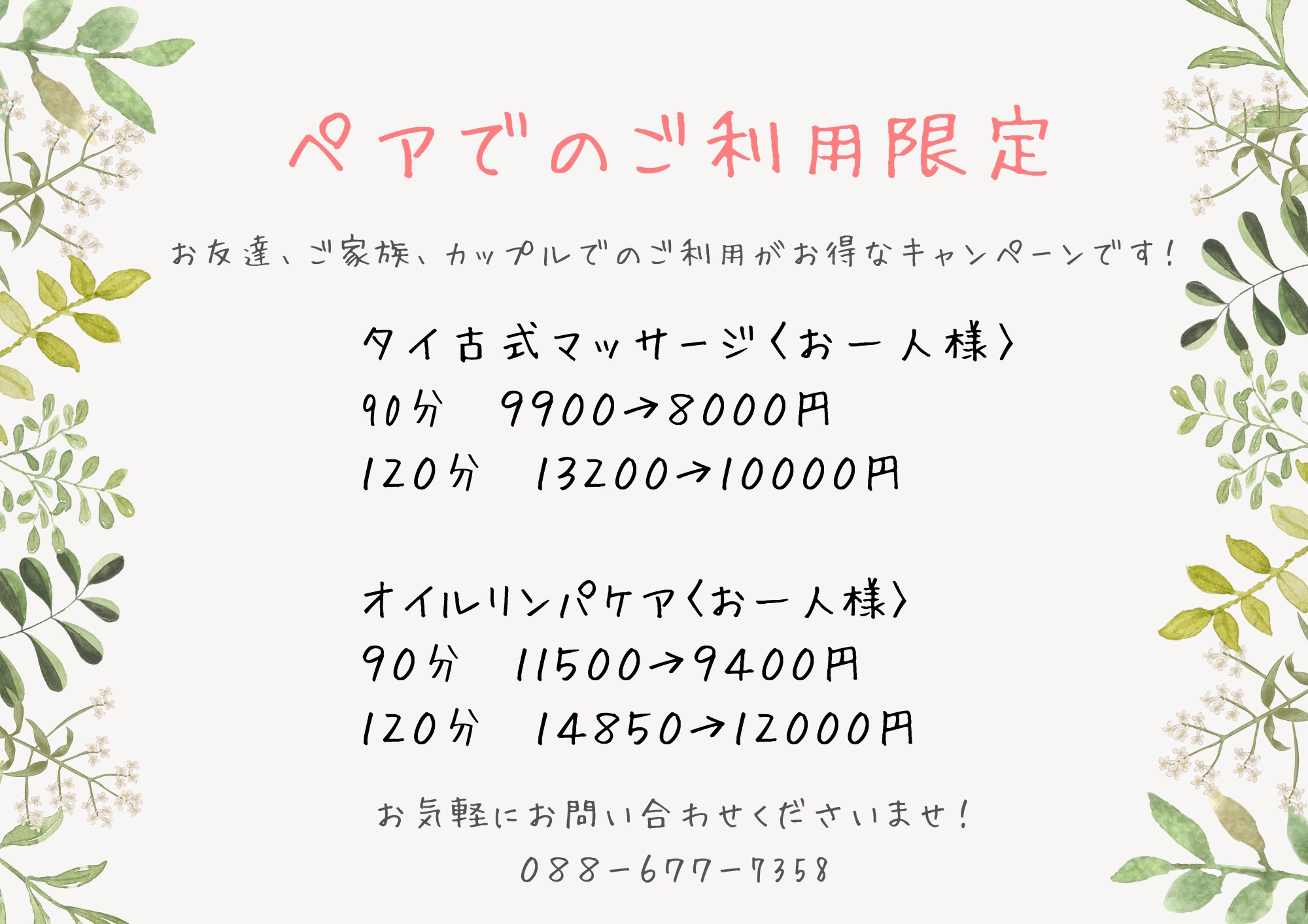 タイ古式マッサージ、オイルリンパケアがお得になります♪